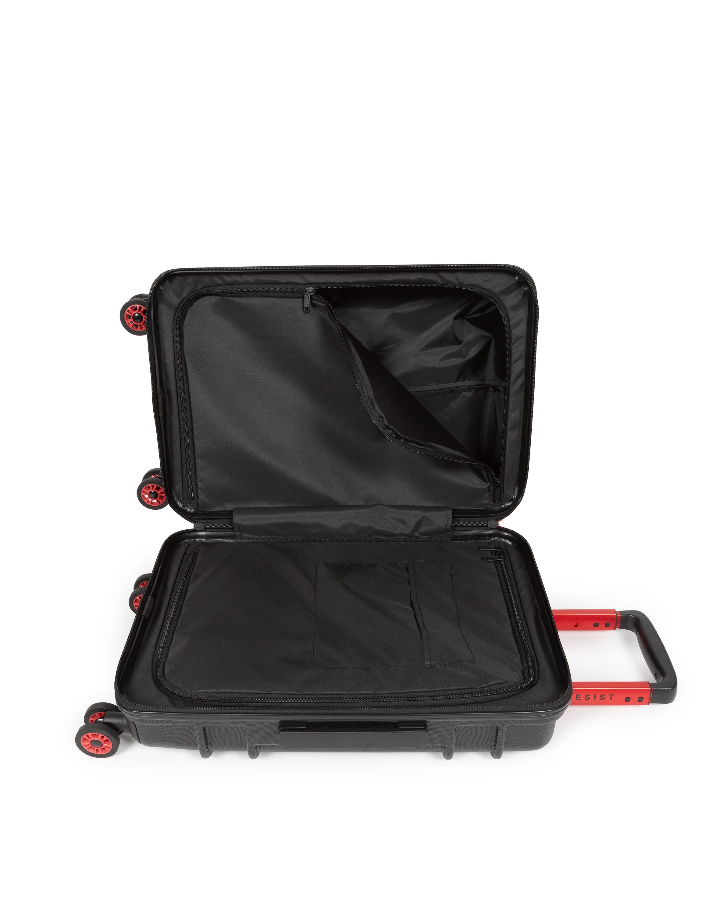 Our hardshell strict carry-on luggage features two zippered compartments for flying visits and overnight stays. This water-resistant cabin bag stands out with red accent details, "Built To Resist" handle branding and Japanese 360-degree spinning wheels.