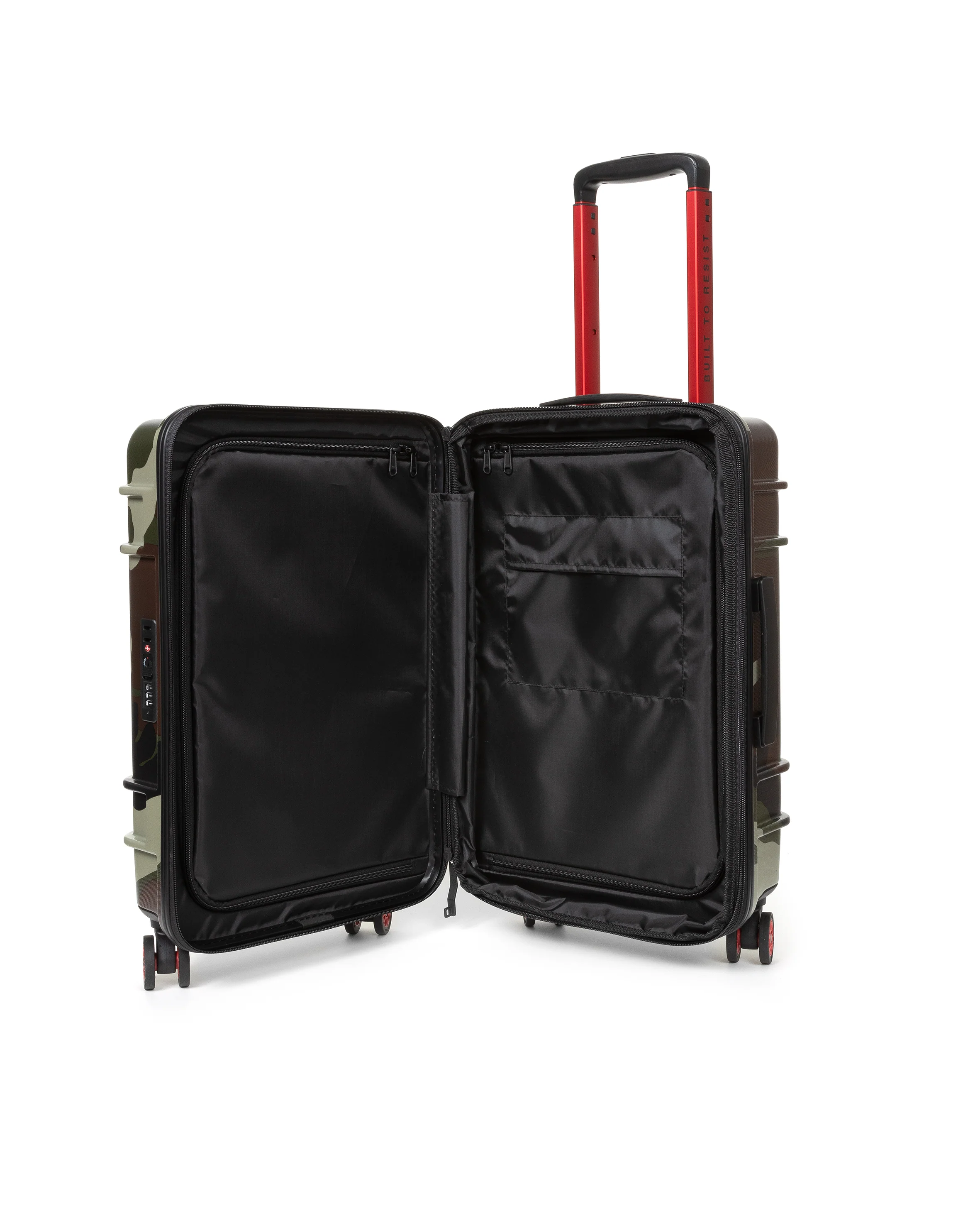 Our hardshell carry-on luggage features two zippered compartments for short trips and weekends away. The lightweight cabin bag stands out with red accent details, "Built To Resist" handle branding and Japanese 360-degree spinning wheels.