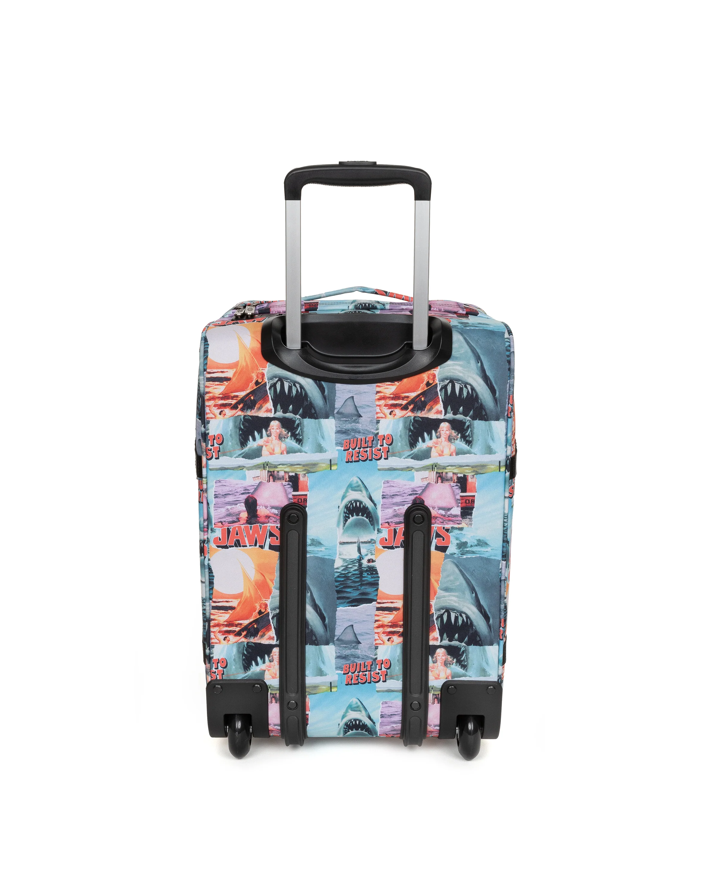 The carry-on luggage from our official collaboration with JAWS. This compact travel trolley features in a nostalgic print with scenes from the cult film series. Load up the double compartments and secure your belongings with the integrated lock. This durable cabin bag features aluminium tubes, protective skids and diamond embossing on the handle.