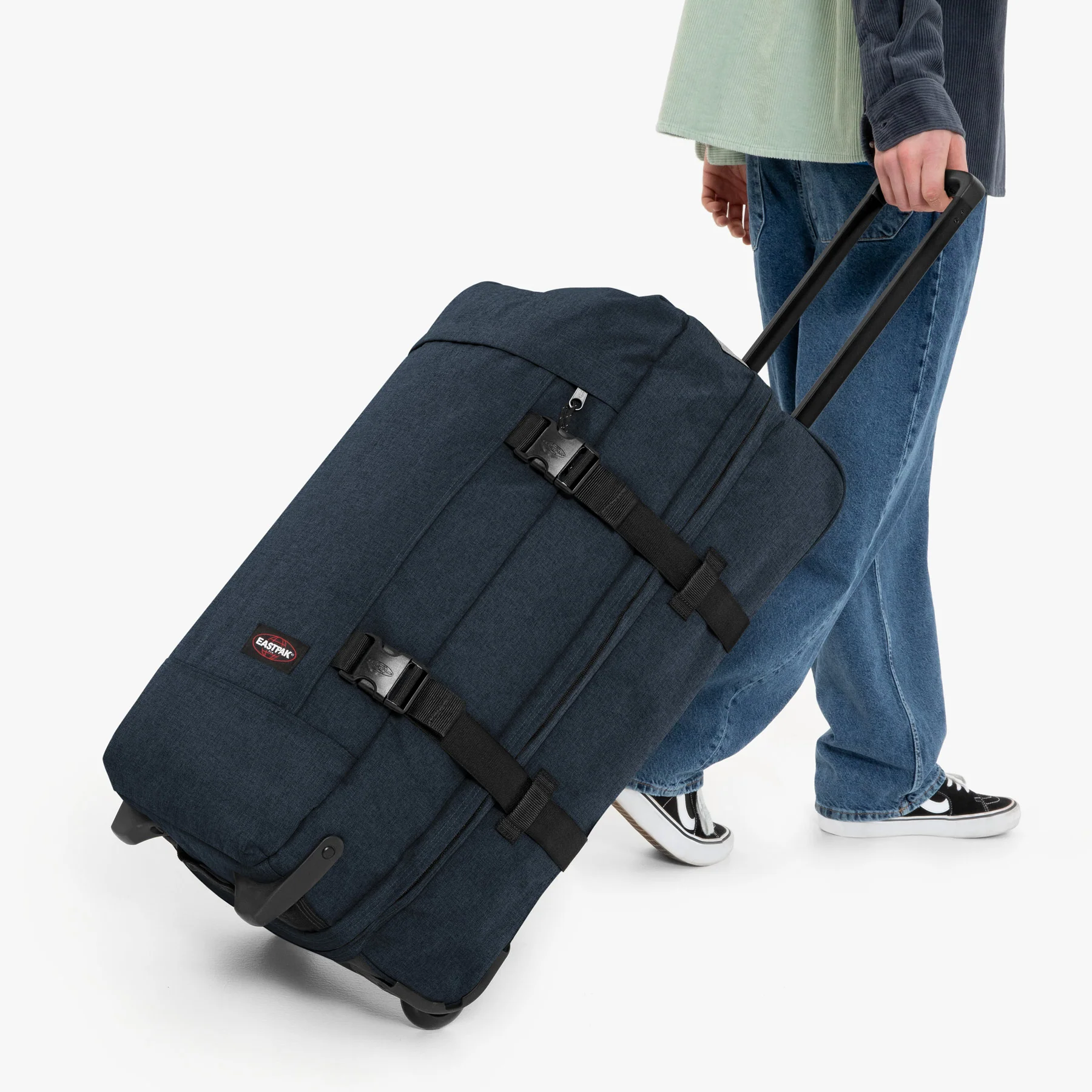 Functional trolley case in Triple Denim: double compartments and free-standing construction make for hassle free travel